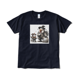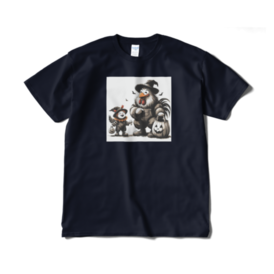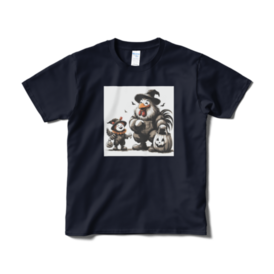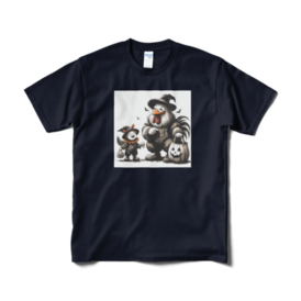 Tシャツ(短納期) - XL - ネイビー楽しいハロウィンがやってきました!この魅力的なシーンには、愛らしいニワトリ親子が小さなコスチュームを身にまとい、まるでハロウィンの祭りに参加するかのようです。 この商品はpixivFACTORYで作られた商品です。サンプル画像は完成イメージのため、実物と異なる場合があります。