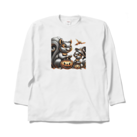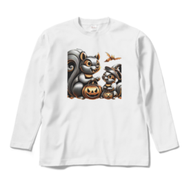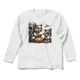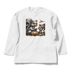 ロングスリーブTシャツ - XL - ホワイト秋の訪れと共に、愛らしいリスの親子がハロウィンの雰囲気を楽しんでいる姿が魅力的に描かれています。 この商品はpixivFACTORYで作られた商品です。サンプル画像は完成イメージのため、実物と異なる場合があります。