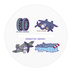 百鬼の創作「アイアンボトム・メモリア」より擬人化フライングパンケーキ、パンジャンドラム、ハボクック、BV151のアクリルスタンドです。台座に元機体が描かれています サイズは100mm×100mm、横長です
