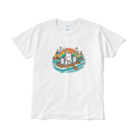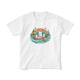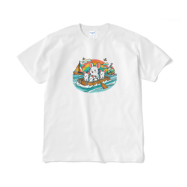 Tシャツ(短納期) - XL - ホワイトかわいいデグーたちがファミリーでお出かけ!このイカダは、彼らにとっての素晴らしい冒険の舞台です。青い海の上で、彼らはのんびりと過ごしながら、心地よい風を感じています。 この商品はpixivFACTORYで作られた商品です。サンプル画像は完成イメージのため、実物と異なる場合があります。