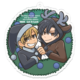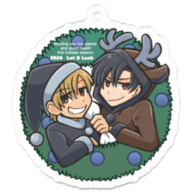黒サンタ衣装の真哉と、トナカイ衣装のくぅさんがリースからのぞく貴重な組み合わせの2024年クリスマスデザインアクリルキーホルダー。 この商品はpixivFACTORYで作られた商品です。サンプル画像は完成イメージのため、実物と異なる場合があります。