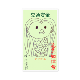 ステッカー - 100 x 100 (mm)配信で作成したアマビエ様の護符がステッカーに登場! アマビエ様に加え「サムハラ」、さらに「急急如律令」で厄除け効果をアップしました。 交通安全ステッカーなので自動車や自転車にもお貼りいただけます。 厚みのあるシールなので栞にもご利用いただけます。 ◆アマビエ 「アマビエさま」とは、江戸時代、熊本の海に現れ、向こう6年の豊作と疫病の流行を予言し、「疫病が流行ったらわたしの写し絵を早々に人々に見せよ」と言って海中に姿を消した、鳥のようなクチバシを持つ半人半魚の妖怪。 ◆サムハラ 江戸時代から続く謎のサムハラ信仰。 サムハラの文字を身に着けると怪我をしないなど様々なご利益がある。 戦時中は銃弾除けの効果を願い千人針と一緒に出兵する家族へ渡したりした。 ◆急急如律令 「急げ急げ律令の如く」つまり「法令に従って速やかに実行せよ」という意味。 単体では使用されない呪文・真言なのでほかの言葉と一緒に使う。 ◆風水の「緑」「黄緑」 「緑」「黄緑」は風水における健康運の色。 特に森や自然を連想させる色がグッド。 ベージュ、アイボリーなどのアースカラーも合わせて使うとまとまりもよく効果的です。 人は自然の力を浴びると気が良くなるので積極的に取り入れたい色。 たくさん使ってもバランスを崩しにくい色なのでおすすめ。 この商品はpixivFACTORYで作られた商品です。サンプル画像は完成イメージのため、実物と異なる場合があります。
