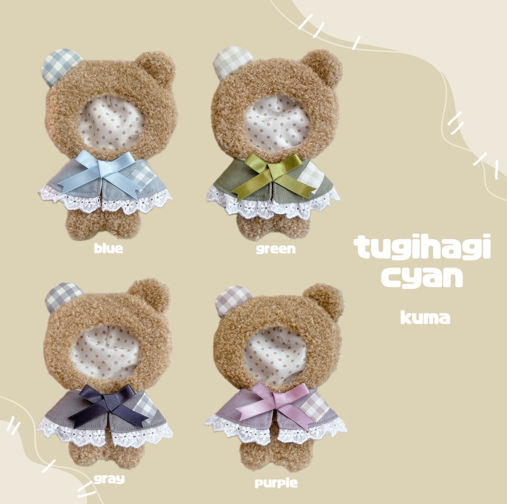 10cmぬいちゃん用の着ぐるみです! ケープは首元のフックで着脱可能になっています。 ケープ後ろのボタンの配色はランダムになります! 顔まわりの布はあまり伸びないのでぐいっと力を入れて着せていただくかたちになります。 頭囲約19cmまでは着用可能であることが確認できています。 そのため12cmぬいちゃんでもお顔が頭囲約19cm以下の細身であれば着用可能です。 また、BCぬいちゃんについては推奨はできませんが一応着用は可能です(かなりぎゅうぎゅうに押し込むことになってしまいます) 12cm・BCぬいちゃんについては、綿がみっちり詰められていたり骨が入っていたりすると着用できない可能性があります。 12cm・BCぬいちゃん用を今後製作するかは未定です。申し訳ありません。 ﹊ ﹊ ﹊ ﹊ ﹊ ﹊ ﹊ ﹊ ﹊ ﹊ ﹊ ﹊ ﹊ ﹊ ﹊ ﹊ ﹊ ✱ハンドメイド作品のため市販品の様な強度はありません。 同一商品でも個体差・左右差があります。また柄物は裁断する位置により多少柄が異なります。