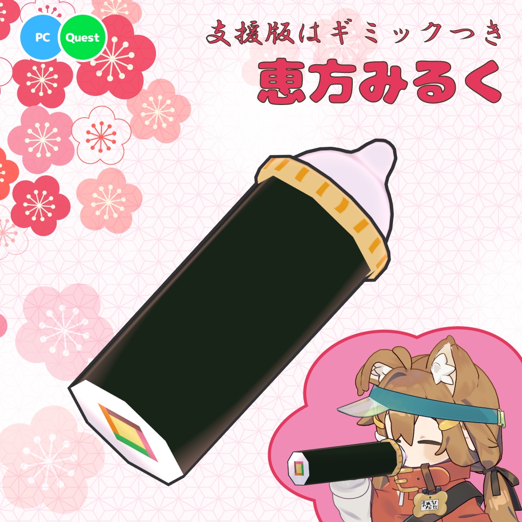 ☆゚+.✧゚+.☆゚+.✧゚+.☆゚+.✧゚+.☆゚+.✧゚☆゚+.✧゚+.☆゚+.✧ \今年の恵方は西南西/ ☆゚+.✧゚+.☆゚+.✧゚+.☆゚+.✧゚+.☆゚+.✧゚☆゚+.✧゚+.☆゚+.✧ VRChat向けに、アバターへ持たせられる 恵方巻き型の哺乳瓶、「恵方みるく」です。 Modular Avatar対応。 アバターにPrefabを入れるだけで、簡単セットアップ♪ ※Modular Avatarは、下記URLより導入してください。 https://modular-avatar.nadena.dev/ja 無料版と支援版があり、それぞれ以下の機能があります。 (無料版) ●恵方みるくのON/OFF機能 右手に持たせた「恵方みるく」の表示・非表示ができます。 (支援版) ●恵方みるくのON/OFF機能 右手に持たせた「恵方みるく」の表示・非表示ができます。 ●ワールド固定機能 表示させた状態の「恵方みるく」を、ワールドに固定できます。 「恵方みるく」を表示していない状態で使用しても、このボタンはOFFになります。 ※VRC Constraintを使用しております。仕様上、ボタン操作の瞬間を見ていないユーザーとは同期がずれるおそれがあります。 ●「恵方みるく」の伸縮機能 口先をアバターのHead部分に近づけると、「恵方みるく」の胴体が徐々に伸びます(最大3倍)。 アバターのHead部分から離すと、「恵方みるく」胴体が徐々に縮みます。 --------------------------------------------------