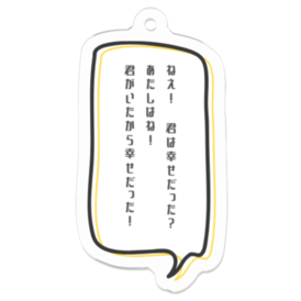 アクリルキーホルダー - 50 x 50 (mm)ねえ! 君は幸せだった? あたしはね! 君がいたから幸せだった!/海野水屑 短歌を印字した小さなアクリルキーホルダーです。 吹き出し内の背景は透明ではなく白色になっています。 前を向けますように。 ※この商品はpixivFACTORYで作られた商品です。サンプル画像は完成イメージのため、実物と異なる場合があります。
