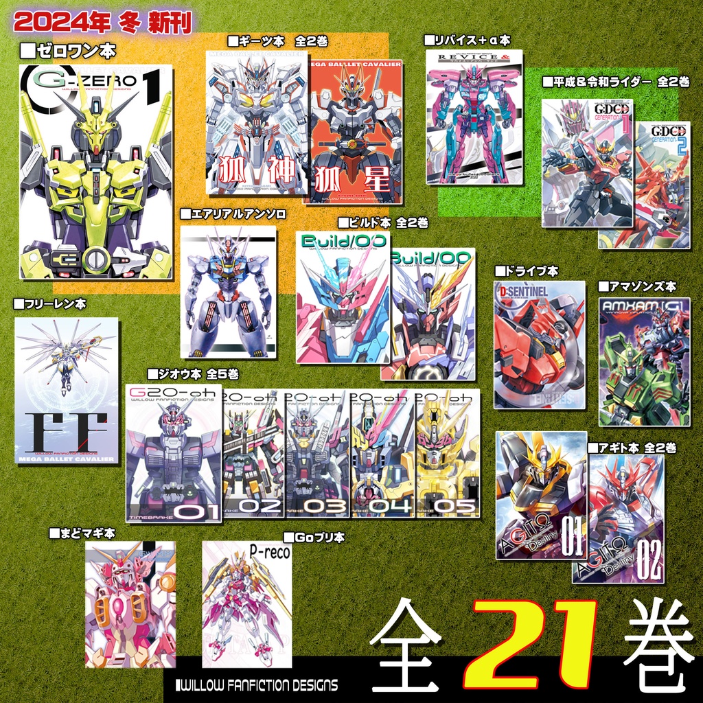 【ういろう本舗メカ本全21巻セット】 これまで当サークル「ういろう本舗」で頒布してきたメカ同人誌21種類をまとめて頒布いたします。送料梱包代はこちら負担のお手ごろな価格となっておりますの。この機会に是非お手にとってみてください(^^ 各刊の詳細はリンクをご確認ください。 □G-ZERO1(ゼロワン×ガンダム0083) 2024年冬コミ新刊 https://willow2nd.fanbox.cc/posts/9085877 B5版フルカラー 40ページ 「仮面ライダーゼロワン」と「ガンダム0083スターダストメモリー」をマッシュアップさせたメカデザインイラスト集です。地球連邦軍に所属したアルト・ヒデンの物語。ティターンズ=A.I.M.S、滅亡迅雷=ジオン残党+エゥーゴ、アナハイムエンタープラズ=ZAIAに対応させた三つ巴の戦いを再現しようとあれやこれやアイデアを詰め込んでおります。 □FF(葬送のフリーレン×ガンダムSEEDFREEDOM) 2024年夏コミ新刊 https://willow2nd.fanbox.cc/posts/8295580 B5版 フルカラー 36ページ 2024年を盛り上げた人気アニメ「葬送のフリーレン」と「ガンダムSEED FREEDOM」を掛け合わせたメカデザインイラスト集。フリーレンの魅力的なキャラクターを、全力でダム化しております。魔法使いガンダムの華麗な共演、是非お楽しみください。 □狐 神 KITSUNEGAMI(ギーツ×水星の魔女 vol.2) 2023年冬コミ新刊 https://willow2nd.fanbox.cc/posts/7164304 B5版フルカラー 38ページ □狐 星 KITSUNEBOSHI(ギーツ×水星の魔女 vol.1) 2023年夏コミ新刊 https://willow2nd.fanbox.cc/posts/6473027 B5版フルカラー 36ページ 「仮面ライダーギーツ」と「水星の魔女」を絡めたメカデザインイラスト集全2巻。アスティカシア学園のベネリットグランプリに参加する連勝ホルダーのエース・ウキヨと、学外からの転校生ケイワ・サクライの出会いから始まる物語。リボルブチェンジを搭載したガンダムの競演をご覧ください。 ■平成&令和ライダー総括本 全2巻 【2021最新刊】 http://suiko108.cocolog-nifty.com/sekizuihansya/gdcd_2016/index.html ・G:DCD GENERATION-1 B5版 フルカラー36ページ ・G:DCD GENERATION-2 B5版 フルカラー36ページ ■ジオウ本 全5巻(仮面ライダージオウ×ガンダムシリーズ) 2019年作品 http://suiko108.cocolog-nifty.com/sekizuihansya/2020/04/post-69b01f.html ・G20-Oh vol.01 B5判 フルカラー38ページ ・G20-Oh vol.02 B5判 フルカラー36ページ ・G20-Oh vol.03 B5判 フルカラー36ページ ・G20-Oh vol.04 B5判 フルカラー36ページ ・G20-Oh vol.05 B5判 フルカラー36ページ ■アギト本 全2巻(仮面ライダーアギト×種死) 2019年作品 withサークル「米3Kg13」 http://suiko108.cocolog-nifty.com/sekizuihansya/2019/11/post-4e666e.html ・AGITΩ Destiny 01 B5判 フルカラー36ページ ・AGITΩ Destiny 02 B5判 フルカラー36ページ ■ビルド本 全2巻(仮面ライダービルド×00) 2018年作品 http://suiko108.cocolog-nifty.com/sekizuihansya/2018/12/uild-00experime.html ・Build/00 vol.01 B5判 フルカラー36ページ ・Build/00 vol.02 B5判 フルカラー36ページ ■アマゾンズ本(仮面ライダーアマゾンズ×陸戦系ガンダム) 2018年作品 http://suiko108.cocolog-nifty.com/sekizuihansya/2018/08/amazon-f964.html ・AMXAM{G] B5判 フルカラー38ページ ■ドライブ本(仮面ライダードライブ×ガンダムセンチネル) 2017年作品 http://suiko108.cocolog-nifty.com/sekizuihansya/2017/09/dsentinel-5663.html ・D-SENTINEL B5判 フルカラー46ページ ■Goプリ本(Go!プリンセスプリキュア×Gレコ) 2015年作品 http://suiko108.cocolog-nifty.com/sekizuihansya/2015/12/post-0dc8.html ・P-レコ B5判 フルカラー32ページ ■まどマギ本(まどかマギカ×新機動戦記ガンダムW) 2012年作品 http://suiko108.cocolog-nifty.com/sekizuihansya/2011/12/index.html ・GW.M.M B5判 フルカラー32ページ ※イベント価格で総計21000円相当になります。