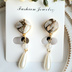 パールや黒チェコビーズを下げて、作り付けのイヤリング一体型のトップにはカッパーカルサイトという人工石を使っています。文字通り、銅とカルサイトを圧縮合成したものです。歌仙に使っていたブルーサンド(青金石)同様、人工石とはいえ美しく、同じ柄は二つとない希少鉱石です。 一目見て、鶴丸やん…と惚れ込んで買ったんですが、ワイヤーフレームの作れない私にはまだ早かった(悲報) ●アレルギー対応商品について 当店ではピアス、イヤリング、チェーン、アジャスター等にサージカルステンレス316を使用時明記しております。 体質には個人差がありますので、必ずしもアレルギーが出ないという保証ではございません。 樹脂ピアスも取り扱っておりますので、そちらもご検討下さい。 ●色褪せ・錆について ステンレス以外の、錆びやすい材質のパーツとの組み合わせの場合、そのパーツの錆びがステンレス表面に付着し「もらい錆」により錆びてしまうケースがございます。 その際は錆びをすぐに除去するようにしてください。 また、水に濡らしたりアルコール・汗等が付着しないようご注意下さい。 ●レジン作品について レジン作品は非常に繊細な為、強い衝撃を与えたり、高温・直射日光に長時間さらさないようご留意下さい。 また、水濡れやアルコール、汗などは劣化の原因となる為、触れないようにご注意下さい。