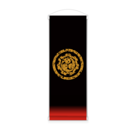 なるわん座招福家紋ミニタペストリー・七角井筒ニ三ツ巴(黒)