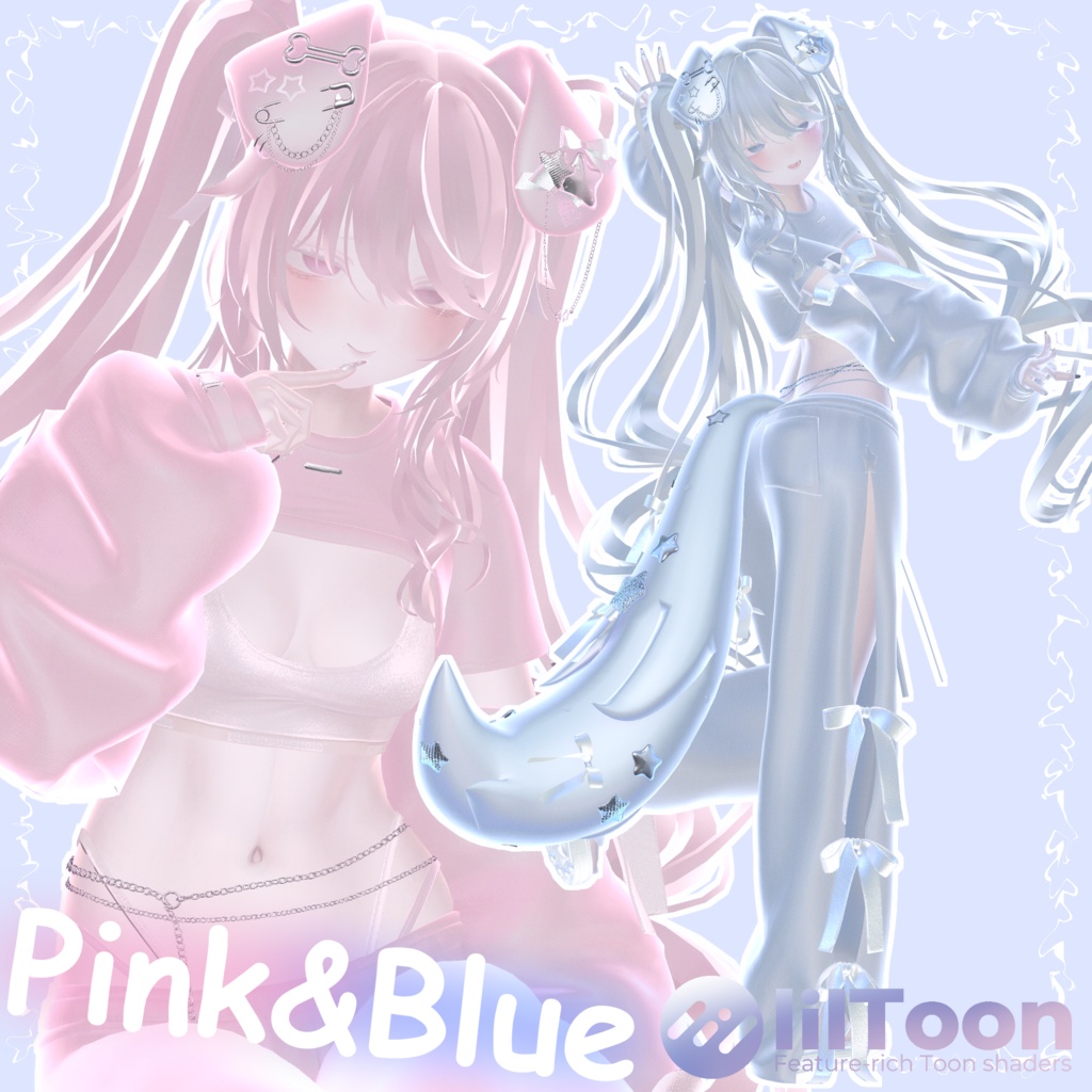 淡いマットな質感がカワイイᐟ.ᐟ 暖色ピンクと寒色ブルーのlilToon Material.ᐟ.ᐟ どのアバターにもご使用いただける、 顔、体用と髪、洋服用のマテリアルが含まれております。 ※最新verのlilToonを使用してください。 ※用意されたプリセット機能により、簡単に設定していただけます。