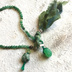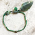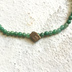 真鍮のカケラをランダムにカットして、Bの刻印をいれたパーツを作り。 石のあいだに通しました。 留め金代わりに、ボタンカットのクリソプレーズをシルクリボンの輪に通します。 飾りにペリドットの小さいビーズと、エメラルドのミニタンブルを。 リボンは長めにしてありますので、短めのほうがお好みでしたら端をカットしてください。 石に合わせて、黄緑のリボンを暗い色味に汚し加工しました。 2㎜の石ですので、とっても細いですし重ねつけも楽しいです。 4枚目の写真では、一番下。 パーツは925&950銀 リボン&糸はシルク 長さ:18cm(リボンの端まで入れると23cm) 石:バーダイト クリソプレーズ ペリドット・エメラルド 発送までの日数が14日になっていますが、お支払い確認後 3日以内に発送いたします。