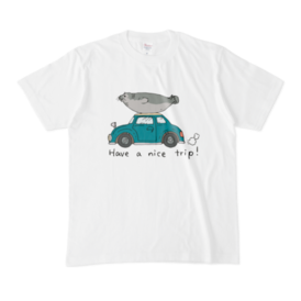 青いクルマの上にアザラシが乗っているイラストがプリントされています。