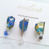 ご覧くださりありがとうございます。 ボスキをイメージしたイヤーアクセサリーたちです。 ①六角形型のカボションにお花と天然石、歯車など時計パーツを合わせて。チェーンとガラスビーズを個性的に繋げたデザイン。(チャームの取り外しはできません) ②鉱石型の3粒タイプ。シルバーのパイプパーツにそれぞれ違うビーズ、天然石をあしらったデザイン。 ③ピアス仕様のため金具変更不可。彼カラーの小さなストーン型トップに、たっぷりのビーズを細いチェーンに飾ったデザイン。キャッチを変えて2wayを楽しめます。 ④大粒の鉱石型。ひと粒タイプ。ペールライム色のカスミソウに、彼の仮面をイメージしたシルバーの時計パーツを封入しました。 ⑤ピアス仕様のため金具変更不可。トップは彼色の深いブルーカラーの小さな貴和クリスタル。瞳の色やイメージカラーなどの細石風カボションを細いチェーンにつなげた、ロングタイプのデザイン。 それぞれに、クールで無骨ながらスタイリッシュに見えるようなアクセサリーを目指し仕立てました。 お気に召す作品がありましたら幸いです。 基礎金具はシルバー、ピアスはポストタイプ、イヤリングはネジバネタイプになります。③⑤はピアスタイプのため金具変更不可となりますので、ご注意ください。 ご購入後に必ずご希望のタイプ(ピアスかイヤリング)をメッセージからご連絡ください。