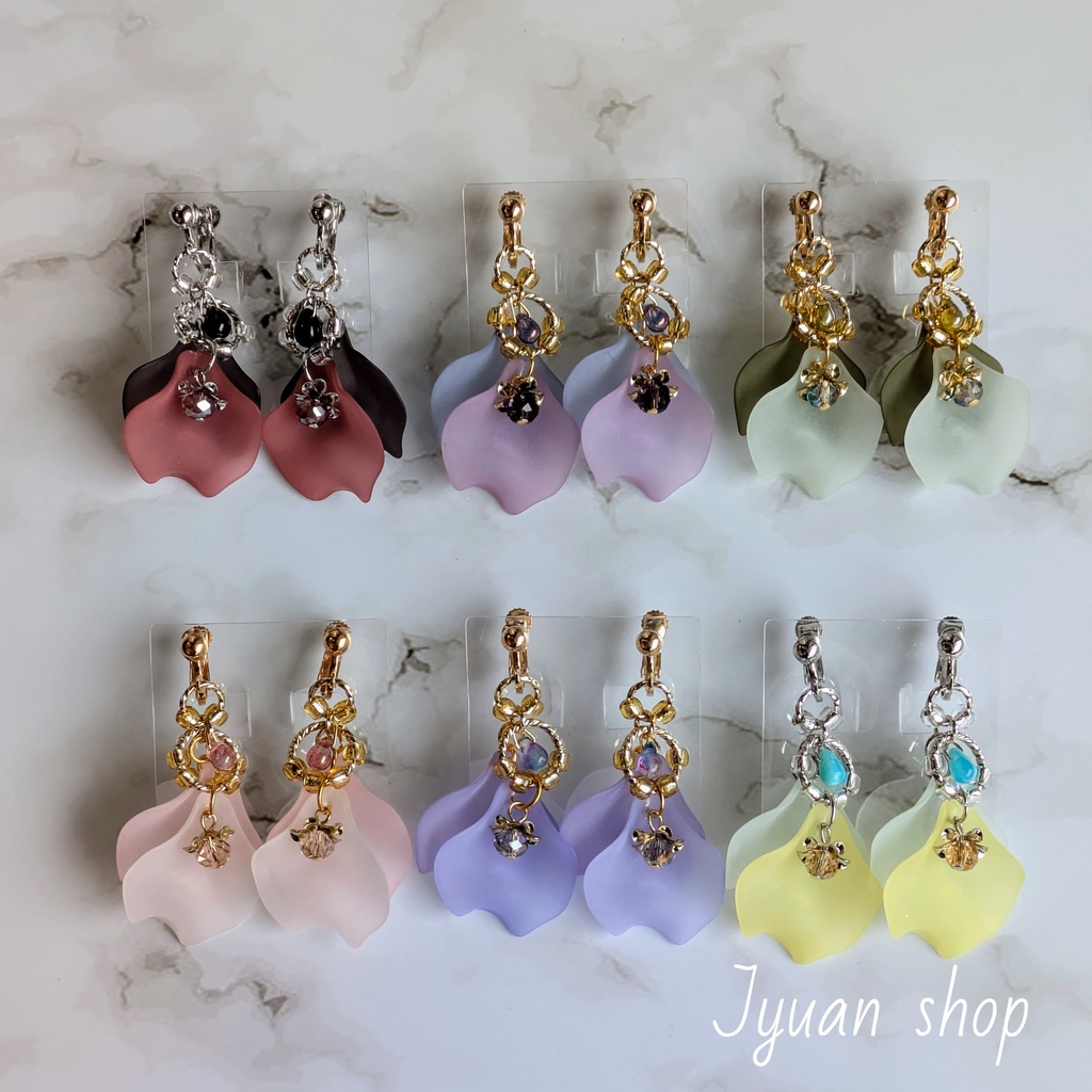 呪術廻戦 京都校 “加茂” “東堂” “メカ丸” “西宮” “真依” “三輪” イメージ イヤリング/ピアスです! アクリルパーツ、ガラスビーズ、アクリルビーズ、メタルパーツを使用しています! 掲載はイヤリングですが、サージカルステンレスのキャッチタイプピアス、フックタイプピアスへ変更可能です!ご希望の場合は、お知らせください! ☆サージカルステンレスは、金属アレルギーを引き起こしにくい素材として知られています!医療器具やボディピアスなどによく使用されています! 全長(モチーフ部分)約5cm ※こちら各1点のみのお品です! 加茂くん生誕祭2025のお祝いに、京都校色違いで作成したお品です! スモーキーカラーの花びらとビーズがキラキラとゴージャスな耳飾りで、普段使いでコーデのアクセントや、エレガントコーデの華やかさUPにも使えるお品です! 推しイメージカラーアクセサリーで気分UP! 華やかさプラスで女子力もUPなお品です!!
