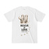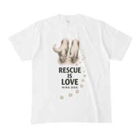 歩いていく後ろ姿を思わせる、足跡だけのシンプルで優しい墨絵風デザイン。 背面にカーブ状の肉球をあしらい、「Rescue is Love」のメッセージを静かに伝える一枚。 保護犬への愛をさりげなく表現したい方にぴったりです。 白地のボディに映えるグレートーンの墨絵が、どんなスタイルにもマッチします。