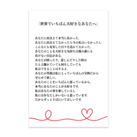 想いを伝えるメッセージのポストカードです。 こちらは「世界でいちばん大好きなあなたへ」のデザインになります。 みなさんの大切な人や大好きな人などへ想いを伝える時に使ってみてはいかがでしょうか? 恥ずかしくてなかなか言葉として直接伝えられない時でもポストカードなら伝えられると思います。 こちらの商品は製作の都合上、10枚セットとなります。 1枚単位で販売はできませんがご了承ください。 この商品はpixivFACTORYで作られた商品です。サンプル画像は完成イメージのため、実物と異なる場合があります。
