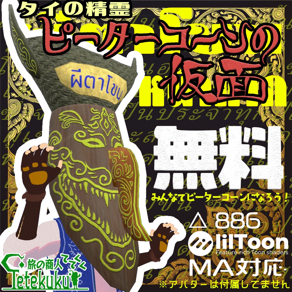 ピーターコーンの仮面(phi ta khon mask) タイのルーイ県ダンサーイ市で毎年開催される奇祭「ピーターコーンフェスティバル」で登場する精霊の仮面です。 VRChatでの使用を想定しています。 ヴァーチャル世界の旅路にお役立てください。 気に入っていただけた方は、ぜひショップのフォローをよろしくお願いいたします! 【特徴】 ・タイの精霊のカラフルで独特なデザインの仮面 ・ModularAvatarセットアップ済みのため、ドラック&ドロップで装着可能。(※位置およびサイズ調整は必要です。) セットアップ済みギミック ◇仮面の表示オンオフ ◇デザインの変更(全3パターン) 【仕様】 ・△886 ・unitypackage形式。インポート&ドラッグアンドドロップだけで導入可能です。 ・シェーダーはliltoonを使用しています。 ・PCのみ対応です。 【内容物】 ・unitypackageファイル ・textureファイル ・FBXファイル ・利用規約(VN3ライセンス) ・導入説明 【注意事項】 ・当モデルの導入前にlilToonシェーダーを予め導入してください。 (https://booth.pm/ja/items/3087170) ・当モデルの導入前にVCCのManage Packagesの画面にて「Avatar Parameters Driver」を予め導入してください。 【免責事項】 当モデルを使用した際、使用者側にいかなる不利益が発生した場合でも当方は一切責任を負いません。 【利用規約・禁止事項】 非商用・商用問わずご自由にお使いください。 詳細な規約は商品に同梱されているVN3ライセンスをご確認ください 【更新履歴】 2025/6/30 V1.01 readmeの日付を修正、blenderファイルを追加 【連絡先】 商品に不具合等ありましたら下記にお問い合わせください ・メール:tetekuku184@gmail.com ・X:@Tetekuku283910