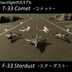 諸元 乗員:2名 全長:17.3m 全幅:12.2m 全高:3.9m 武装 T-33 Comet 練習用レーザーガン F-33 Startdust M16A 20mmバルカン 空対空ミサイル 中距離空対空ミサイル AAM-4 4発 短距離空対空ミサイル AAM-5 2発 共通装備 可変オートフラップ 操縦権を前後席で交代 アナログ計器 高度計 速度計 マグネティックコンパス 時計 MFD レーダー 武装表示 水平表示 HUD & HMCS 旋回秒間角度表示 旋回半径表示 加速度表示 ポリゴン数 本体(Cockpit含む):約78000ポリゴン LODモデル :約67000ポリゴン