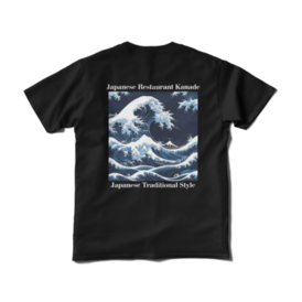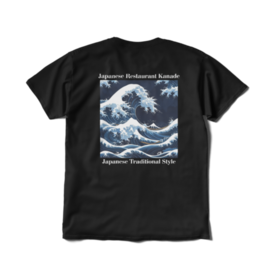 浮世絵風のオリジナル波模様をバックプリントにあしらったクールなTシャツ 白/黒/紺の3色展開となっています この商品はpixivFACTORYで作られた商品です。サンプル画像は完成イメージのため、実物と異なる場合があります。