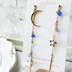 ■古の人々は空を見上げ 太陽や無数の星々から知恵を生み出しました。 太陽の軌道を知り、月の満ち欠けを知り、 星々を繋いで星座を描きました。 科学が発展し、月へ降り立ち 望遠鏡が遥か遠くの銀河を映し出す現代 宇宙への憧れは、さらなる知識と知恵を生み出します。 =*==*==*=「宇宙を想う」=*==*==*= アシンメトリーにビーズを繋いだアクセサリーです。 星々を繋いだ軌跡を表現しました。 —————————————————— サイズ:月チャーム側 長さ 約87㎜ × 幅 約13㎜ 星チャーム側 長さ 約76㎜ × 幅 約 9㎜ (写真現物での最長・最大幅です) ポスト&キャッチタイプのピアスでご用意していますが 無料の金具交換が可能です。(一覧画像参照) (フックタイプへ変更した場合、全体の長さが長くなります) アクセサリーは小箱に入れてお届けいたします。 紛失防止や酸化防止の保管用としてご利用ください。 —————————————————— <金具変更等のご希望について> ・ピアス/イヤリングの金具変更、アレルギー対応金具への変更の ご希望がある場合、まずはメッセージにてお問合せくださいませ。 <お手入れ方法> ・金具はメッキ仕様のため、長時間の水濡れや直射日光を避け メガネ拭きなどの柔らかい布で軽く汚れを拭いてください。