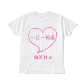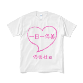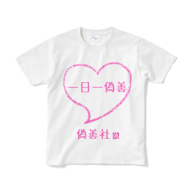 「一日一偽善」Tシャツ(ピンク文字)です。 動機がどれだけ不純でも、ちっぽけでも、その先に誰かの笑顔が生まれるのなら、それだけで良いんじゃないか。 そんな想いから「偽善社」は、その全ての商品の売上のごく一部(1%)を、国連UNICEF協会などの慈善活動の支援に使わせていただきます。 もちろん、「たった1%か」と、そう思われるかもしれません。私たちの活動は、まだまだ、ちっぽけです。 それでも、世界のどこかで、まだ見ぬ誰かの笑顔に繋がっていく。その小さな可能性を私たちは信じ、偽善活動をはじめます。 この新しい始まりに、あなたも一緒に一日一偽善に参加しませんか。 この商品は受注生産品です。商品の不具合以外による返品・交換は受け付けておりませんのでサイズ等をご確認の上でご購入ください。 また、サンプル画像は完成イメージのため、実物と異なる場合がありますのでご了承ください。