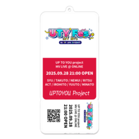 ◆UP TO YOU projectグッズ「UTY Fes. チケット風アクリルキーホルダー」◆ 期間限定販売! 2025年9月28日開催の「UTY Fes.」チケット風アクリルキーホルダーです。 ※この商品はpixivFACTORYで作られた商品です。サンプル画像は完成イメージのため、実物と異なる場合があります。 ※ご注文は各1種ずつ、1個からとなります。 ※テンプレートサイズは「10cm×10cm」で作成しております。余白を含めておりますので、実際にはそれよりも小さなサイズでの出力となります。 ※こちらは「通常のアクリルキーホルダー」です。ホログラム仕様ではございません。 ※QRコードは「UP TO YOU project」公式HPにアクセスできる仕様となっております。今後、QRコードの都合上他サイトに繋がる可能性もございます。予めご了承ください。