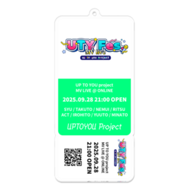 ◆UP TO YOU projectグッズ「UTY Fes. チケット風アクリルキーホルダー」◆ 期間限定販売! 2025年9月28日開催の「UTY Fes.」チケット風アクリルキーホルダーです。 ※この商品はpixivFACTORYで作られた商品です。サンプル画像は完成イメージのため、実物と異なる場合があります。 ※ご注文は各1種ずつ、1個からとなります。 ※テンプレートサイズは「10cm×10cm」で作成しております。余白を含めておりますので、実際にはそれよりも小さなサイズでの出力となります。 ※こちらは「通常のアクリルキーホルダー」です。ホログラム仕様ではございません。 ※QRコードは「UP TO YOU project」公式HPにアクセスできる仕様となっております。今後、QRコードの都合上他サイトに繋がる可能性もございます。予めご了承ください。