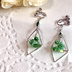 BAEモチーフのイヤリング。 三角形レジンの中には、各キャラクターのイメージカラーのオーロラフレークを封入。 ドライフラワー(スターフラワー)は、枠に囚われない3人のイメージから、レジンに収まらずはみ出るデザインにしました。 皮膚との直接接触部分のパーツには、サージカルステンレスやニッケルフリーを使用しておりますが、金属アレルギーをお持ちの方はご注意ください。 [サイズ]約7cm(金具含む) [重量]片側 約3g(金具含む) ※使用素材や花材は変更になる可能性があります ※花材の大きさや色味は仕入れ状況により差異があります ※商品の一部にレジンを使用しています ※ピアス(キャッチ)のみ制作の関係上、丸カンが1つ増えます(金額は変わりません)