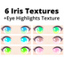 6 iris textures for VRoid model eyes. Each texture is a different color .png file. Includes one eye highlights texture .png file.