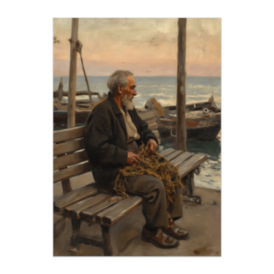 この商品はpixivFACTORYで作られた商品です。サンプル画像は完成イメージのため、実物と異なる場合があります。 古びた港のベンチに座り、網を手に遠い海を見つめる老人漁師を描いた油絵風ポスター。静かな海辺の哀愁を感じられる一枚。