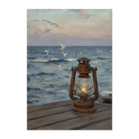 この商品はpixivFACTORYで作られた商品です。サンプル画像は完成イメージのため、実物と異なる場合があります。 桟橋に置かれた古びたランタンと、柔らかな夕空・カモメを描いた油彩風ポスター。穏やかな海風を感じる癒しの一枚です。