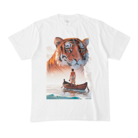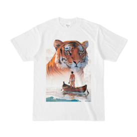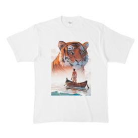 穏やかな水面に浮かぶ小舟と少年、そしてその背後に大きく浮かび上がる虎の姿を描いた幻想的なアートデザイン。自然の神秘と冒険心を象徴するインパクトのあるグラフィックTシャツで、ユニークなファッションを楽しみたい人におすすめです。