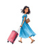 (スーツケース・地球儀・パスポート・飛行機・カメラ・地図・列車・バス・サングラス・帽子・傘・キャリアケースを引いている女性)