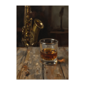この商品はpixivFACTORYで作られた商品です。サンプル画像は完成イメージのため、実物と異なる場合があります。 ジャズの夜を思わせるウイスキーとサックスの静かな静物画風ポスター。大人の空間を彩る雰囲気のある一枚。