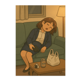 この商品はpixivFACTORYで作られた商品です。サンプル画像は完成イメージのため、実物と異なる場合があります。 お仕事帰りのちょっとした日常を切り取ったユーモアポスター。ソファでスマホを握ったまま寝落ち、テーブルにはコンビニの袋とおにぎり、缶ビール。思わずクスッと笑えるシーンを、あたたかみのあるイラスト調で表現しました。お部屋のアクセントやSNS映えにもおすすめです。