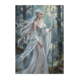この商品はpixivFACTORYで作られた商品です。サンプル画像は完成イメージのため、実物と異なる場合があります。 長い白銀の髪を風に揺らし、杖を手に立つエルフの魔導士。清らかで神秘的な世界を感じさせるファンタジーポスターです。