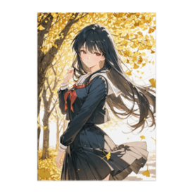 この商品はpixivFACTORYで作られた商品です。サンプル画像は完成イメージのため、実物と異なる場合があります。 黄金色に染まる銀杏並木の下、振り返るように立つセーラー服の少女を描いたポスター。舞い散る葉とやわらかな光が、秋の静かな美しさを演出しています。部屋に飾れば、季節の温もりを感じさせる一枚です。