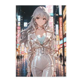 この商品はpixivFACTORYで作られた商品です。サンプル画像は完成イメージのため、実物と異なる場合があります。 煌めくネオンの中を歩く、美しき白のレザースタイル。 街の光を反射する彼女の姿は、強さと柔らかさを併せ持つ。 夜のシティシーンを彩る、洗練された美のポスターです。