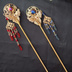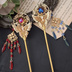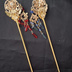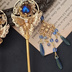 とある昼下がりのかんざし屋。 うんうん唸りながら店内を回って悩む青年が1人。 彼は恋人に結婚を申し込む為、かんざしを選んでいる。 あの娘に合う色はこれか…?いや、これかもしれない…はたまた…。 その様子を見て、かんざし屋の店主はふふふと笑った。 小一時間後。 やがて青年は鮮やかな色のかんざしを1本、手に取った。 ーーーーーーーー 恋人を思って青年が選んだかんざしは、一体何色だったのか。それは彼の恋人しか知らない秘密。そんな物語をイメージして制作しました。 チェコ製の大きな半円ガラスビーズをカボションとして使用しております。大きな蝶々と蝶々の透かしパーツを組み合わせました。 かんざしから下がったチャームは、金属のチャームとチェコビーズを組み合わせ、動く度にユラユラと揺れる仕様です(チャームは取り外せません) ガラスビジューのカラーは、紅(赤色)、留紺(青色)からお選びいただけます。 普段使いは勿論、ゴシック装やスチパン装、コスプレ、LARPの装備品などにご使用出来ます。 ドールやぬいぐるみ、フィギュアなどに持たせて杖としてもご使用できます。 かんざし大きさ 縦:約18cm 横:約3.5cm チャーム大きさ 縦:約8.5cm 横:約2cm 素材 チェコガラスビーズ、ガラスパーツ、金属パーツ(メッキ)、接着剤、レジン ◇注意事項 こちらはハンドメイド作品です。既製品に比べて強い圧や水濡れに弱いです。取り扱いにはご注意ください。 チェコガラスには傷がついております。初期傷となりますので、ご了承いただいた上でのご購入をお願いいたします。 かんざしとしてご使用する場合、装飾部を掴んで髪を纏めると装飾が外れてしまいます。必ずスティック部をお持ちになり、ご使用ください。 お使いの端末の設定により、実物と写真の色味が違って見えることがございます。 箱に入れてリボンをかけた状態での発送となります。追加のラッピングは出来ませんのでご了承ください。