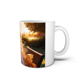 <マグカップ>獅子座の女神:枯れ葉舞う公園のベンチで待つ君は