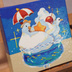 器に盛り付けられた、爽やかな夏を満喫するアヒルたち。 ふわふわのクリームにはお日様のようなさくらんぼやヒトデ型のクッキーが彩りを添える、大満足の一品。 キャンバスにアクリル絵の具 Acrylic on canvas, about 15cm×15cm --------------------- 【ご購入時の注意点】 ▼画面表示の色味について ご使用のモニターやスマホの画面設定、照明の種類によって実物の商品の色が参考画像と異なる場合があります。 参考画像は色合いを完璧に示すものではありませんのであらかじめご了承ください。 ▼キャンバスのサイズ差や歪みなど キャンバスには個体差がありますので、微妙なサイズ差や形状に多少の歪みがある場合があります。 ※色味やサイズのイメージ違いなど、お客様のご都合による返品・交換・返金はお断りしております。何卒ご了承くださいませ。