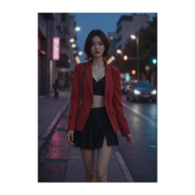 この商品はpixivFACTORYで作られた商品です。サンプル画像は完成イメージのため、実物と異なる場合があります。 夜の街を歩く、赤いジャケットの女性。 ネオンの光と雨上がりの路面が輝く中で、 1980年代の都会的な強さと美しさを描いた一枚です。
