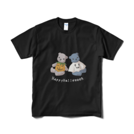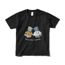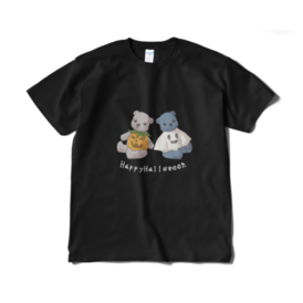灰色のくまのぬい、ちーちゃんと藍色のくまのぬい、あいちゃんのイラストのハロウィンTシャツです。 この商品はpixivFACTORYで作られた商品です。サンプル画像は完成イメージのため、実物と異なる場合があります。