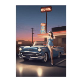 この商品はpixivFACTORYで作られた商品です。サンプル画像は完成イメージのため、実物と異なる場合があります。 黄昏に輝くクラシックカーとモーテルサイン。 夜明け前の静けさを切り取った、ロマンティックなピンナップアート。 レトロアメリカンの哀愁と美しさが交錯する一枚。
