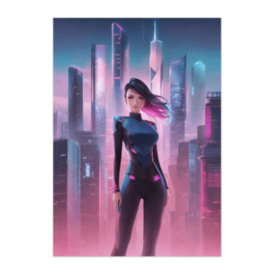 この商品はpixivFACTORYで作られた商品です。サンプル画像は完成イメージのため、実物と異なる場合があります。 高層ビル群を背に立つ女性。風に髪が揺れ、近未来都市の夜明けを見つめる姿が印象的。ピンクとブルーの光が織りなすサイバーパンクな世界観を描いた作品です。