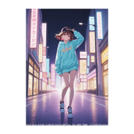 この商品はpixivFACTORYで作られた商品です。サンプル画像は完成イメージのため、実物と異なる場合があります。 ネオンに輝く街角で、ヒップホップを踊る少女。 オーバーサイズのパーカーとキャップが映える、現代アニメ風ストリートシーンです。 軽やかなステップと笑顔が夜の街にリズムを刻む瞬間を切り取りました。