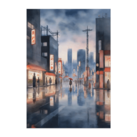 この商品はpixivFACTORYで作られた商品です。サンプル画像は完成イメージのため、実物と異なる場合があります。 雨上がりの都市に灯が滲む。 濡れた舗道に映る街の幻影と、傘の赤だけが浮かぶ静かな時間。 水墨と水彩の調和が描く、現代の詩的風景です。