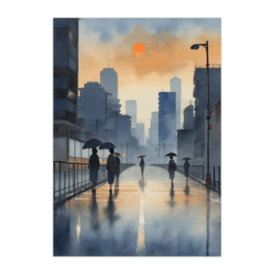 この商品はpixivFACTORYで作られた商品です。サンプル画像は完成イメージのため、実物と異なる場合があります。 夕陽が沈む歩道橋。 雨がやみきらぬ空の下、濡れた路面が光を映し、人々の傘がゆるやかに行き交う。 水墨の静けさと都会の呼吸が重なる一枚です。