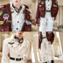 セットG=単品A+単品B+単品C+単品D(ジャケット+シャツ+襟帯+パンツ+ジャンプスーツなど) カラー: 【G-1】:ブラックジャケット(人造革/布地)+ホワイトシャツ+深緑ネクタイ+カーキパンツ+グリーンジャンプスーツ 【G-2】:カーキグリーンジャケット(人造革/布地)+グレーシャツ+ブラックネクタイ+ブラックパンツ+ブラックジャンプスーツ 【G-3】:レッドジャケット(布地)+ホワイトシャツ+ブラウンネクタイ+ブラックパンツ+ホワイトジャンプスーツ