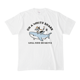 Tシャツ - XL - 白ホホジロザメ(ホオジロザメ)君に乗って魚捕りをする三毛猫君です!