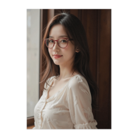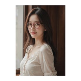ポスター - B2この商品はpixivFACTORYで作られた商品です。サンプル画像は完成イメージのため、実物と異なる場合があります。 窓辺に立つ女性が、赤ぶちメガネをかけて穏やかに微笑むポートレート。柔らかな自然光とエレガントなブラウスの質感が調和し、知的で温かみのある雰囲気を醸し出します。見る人の心を落ち着かせる上品な作品です。